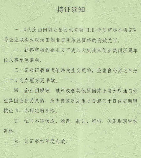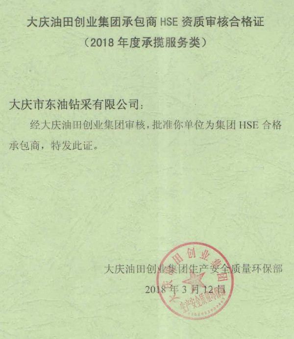 圖片新聞:大慶油田創(chuàng)業(yè)集團(tuán)承包商HSE資質(zhì)審核合格證(2018年度承攬服務(wù)類)